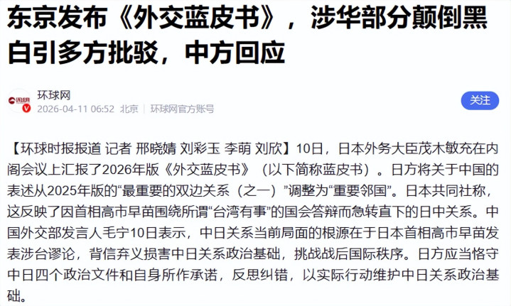 日本外务省在4月10日发布新版《外交蓝皮书》,最刺眼的一处,是对中国定位的文字挪动,从过去偏“抬高”的表述,改成“重要邻国”。